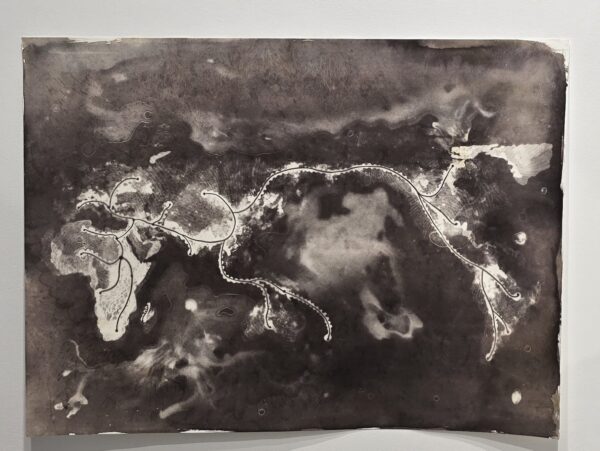 Fig. 3. Sènami Donoumassou, Couleur de l’eau, couleur de l’âme, couleur du sang, 2024. Close-up of the map in the installation. Photo: Adéwolé Faladé.