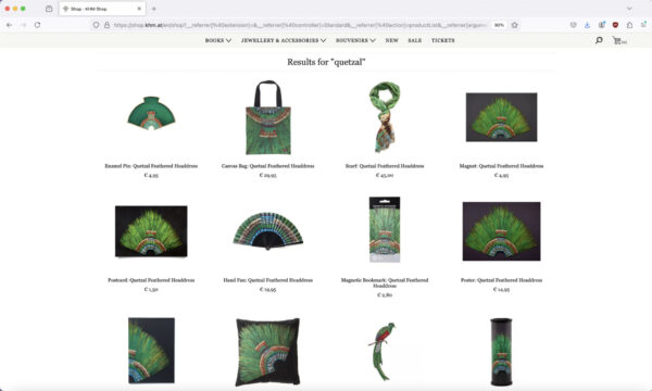 If you visit the website of the shop affiliated with the Weltmuseum, part of the Kunsthistorisches Museum in Vienna, you will currently find twenty-two souvenirs featuring or relating to one of the most controversial cultural objects in the museum’s collection—the commonly known Penacho de Moctezuma.[1] While in Nahuatl it is called quetzalapanecáyotl, on the website and some of the souvenirs, it is announced as “Quetzal feathered headdress”. You can find these souvenirs under diverse categories, such as “Welmuseum”, “Aztec”, “Feather”, “Quetzal”, in a price range from EUR 1 to EUR 70. Some come with short descriptions.