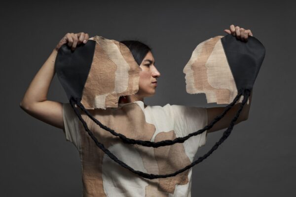 I am sewing gestures of transformation. I am making faces, sewing faces, sewing them onto dresses. Hair and braids frame my own face and my sewed faces. I am referencing Gloria Anzaldúa’s book Making Face, Making Soul (1990). In it, she describes an in-between space where resistance becomes possible—a space that allows one to reflect on one’s own face. From this perspective, we understand which faces are essential, which remain part of the self, which are strategic, which are useful, and which can be discarded as unnecessary. Anzaldúa refers to this in-between space with the metaphor of a specific type of fabric: an interface that provides support but isn’t visible, usually sewn to the underside of the fabric. Here, the process of making and unmaking is revealed—the interface is turned outward. Exploring this space, braids become part of faces, different textile elements are joined to the body, gestures are explored that protect, reflect, and provide support.