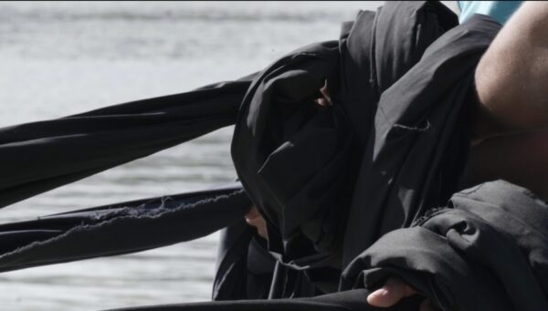 Interweaving is a collective gesture—it requires us to wait for one another, to let each body understand and do what is necessary without speaking. The fabric strands intertwine with arms and legs, with the water and the sand, while the braid grows longer and longer. Both the performance and the braid are in the water, following and adapting to its movement, to its fluidity. A gesture, an involvement, is required to establish a connection with the water; it is a process, an activation. Water flows, always in motion—it constantly transforms, much as we do.